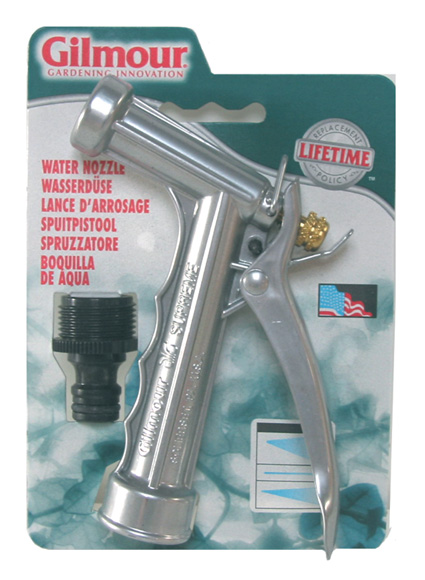 The Gilmour B nozzle has a moulded grip for spraying cold water. - solid brass valve stem - hold-open clipfor continuous spraying - rust resistant spring - "duck" packing for leak proof seal - 12 pieces per packing